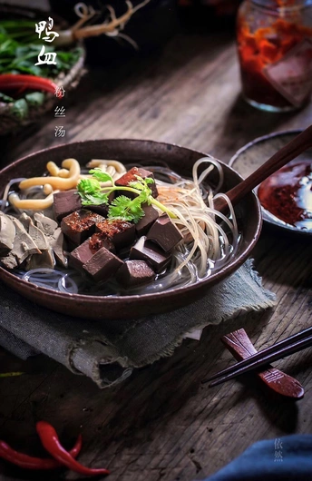 鸭血粉丝汤是南京的特色名吃,是金陵菜和金陵小吃中重要的代表,是久负盛名以鸭为特色的美食之一。鸭血粉丝汤由鸭血、鸭肠、鸭肝等加入鸭汤和粉丝制成。以其口味平和,鲜香爽滑的特点,以及南北皆宜的口味特色,风靡于全国各地。 南京自古喜食鸭馔,盛行以鸭制肴,有“金陵鸭肴甲天下”之美誉。鸭血粉丝汤为迎合各地饮食特色进行改良,在制作时,各地均有不同,不过不论是鸭汤的烹制,还是鸭血、鸭肝与鸭肠的制作,都采用的是传统制作金陵盐水鸭的方法,是金陵菜中重要的代表。(文字摘自网络)