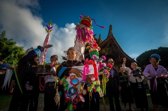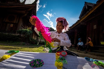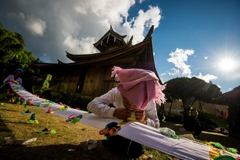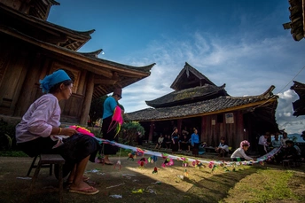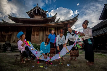 户撒阿昌族信奉南传佛教,村寨里的经幡制作是由女人们共同完成