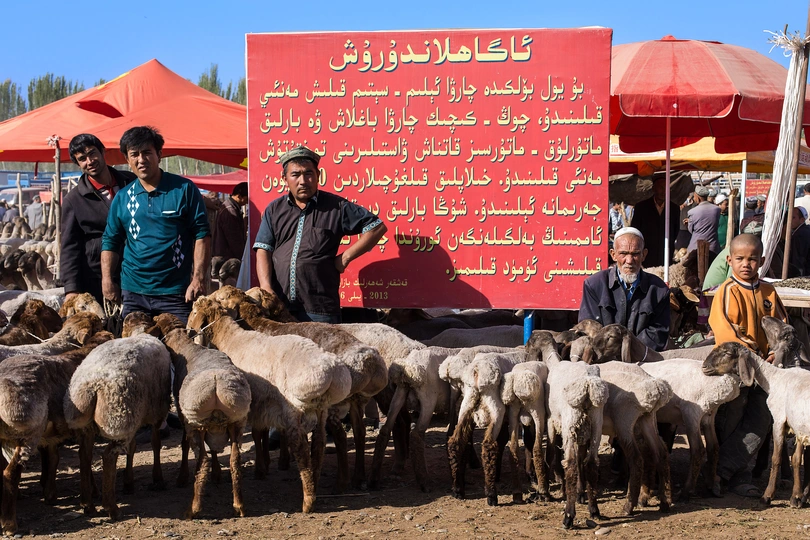 维吾尔语中,“巴扎”就是市场的意思。对于维吾尔族人来说,巴扎是一种精神象征。从能下地开始,他们就会去参加各种巴扎,高兴的时候要去,忧伤的时候也要去,每次去巴扎,就好像是他们精神上的一次洗礼。在喀什最大的牛羊巴扎,每个周日都会聚集大量的商人,把自己的牛羊骆驼运到这里进行交易买卖。
