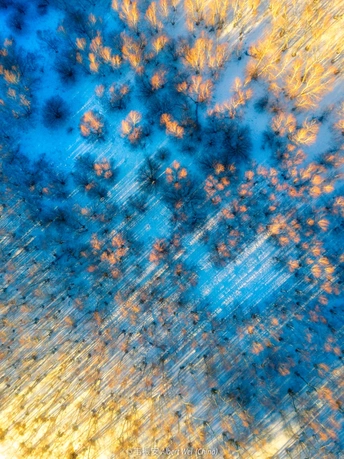 冬季的乌兰布统,无人机升到上空,从上往下俯视时,看到了树梢的那一点点金光。