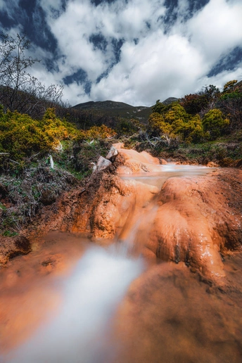 贡嘎群山地区,雪山融水在5月汇成小溪从远方流下,溪床在日积月累的流水作用下形成橙黄色的钙化滩。