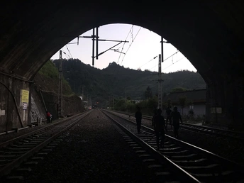 在小城火车隧洞口看到工人下班的一幕