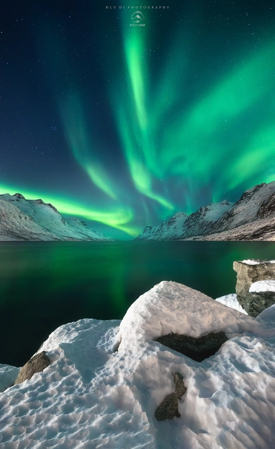 在飞往挪威北部城市的途中,从飞机窗外望去,北极光已经开始飞舞。到达后,迅速收拾行李,驱车赶往城市附近的峡湾,迎接极光在空中绽放的时刻