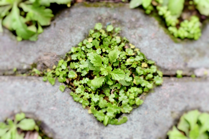 停车坪的空隙中长满了许多小草,意趣丛生。