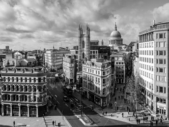晴天有乌云,站在高楼拍摄伦敦老金融区