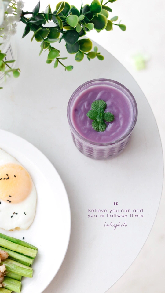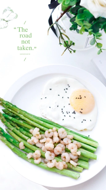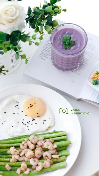 🌿🌿🌿 早餐打卡828 今日早餐 紫薯奶昔+芦笋虾仁+太阳蛋 主食:紫薯奶昔 蛋白质:虾仁 鸡蛋 果蔬:芦笋