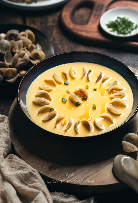 蛤蜊蒸蛋做法:水和蛋的比例是2:1,搅拌均匀,过不过筛无所谓,我都不过筛,关键上锅前要盖保鲜膜,防止在蒸的过程中,锅盖的水蒸气掉下来,就会有很多孔;大火蒸,时间上浅盘5_6分钟差不多,不然会太老,大(深)盘子可适当延迟
