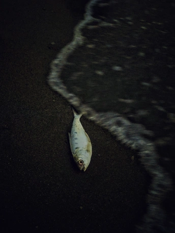 傍晚时分,深圳西湾公园海滩上,一只鱼被海浪打上岸,可惜已无生命迹象了。很多时候,生死往往只在一念之间。