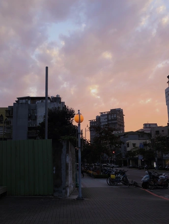 旅行的时候偶遇的夕阳和有着夕阳色彩的路灯