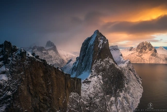 重装在积雪到大腿位置的情况下徒步三个多小时上山,由于北极圈附近冬季日照时间极短,日出时登山,到达山顶已是日落。在相机拍摄完成后,尝试用无人机寻找新的角度,记录下左边正在暴风雪,右边却是美丽日落的充满魔力的瞬间。