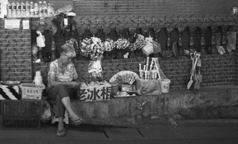 厦门鼓浪屿上一个老奶奶正在卖食物和小玩意