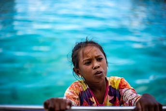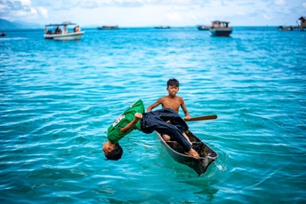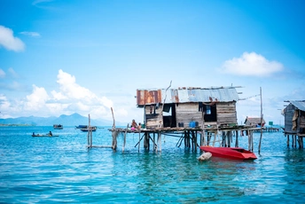 巴瑶族世代生活在海上,小木屋就是他们的房子,有游客过来他们就卖力表演乞讨零食和钱