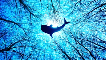 在朝阳公园拍摄树干纹理姿态时,抬头发现树干笔直向上,恰好形成了一个头大尾小的“鲸鱼”的形状。 于是再利用一张水波的图片和一张鲸鱼的仰拍照片后期合成了这张以环保为主题的创意摄影。
