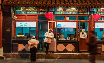 从王府井小吃街路过的一瞬间,从门框里往外探的、站在门口的、在台阶下面低着头的三个厨师正好在看着远处聊天,加上从镜头前走过的人和在橱窗里的那个厨师,五个人之间形成了和谐的层次和交流,盎然生趣。