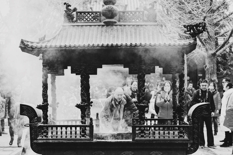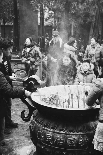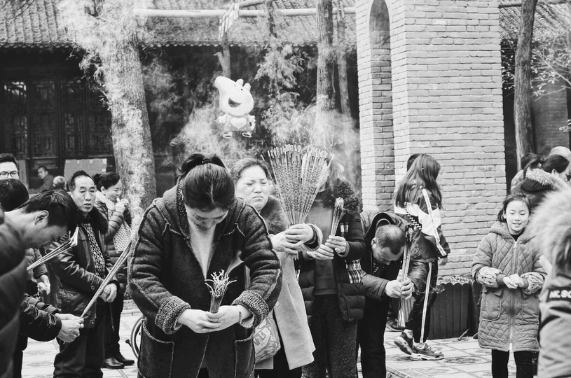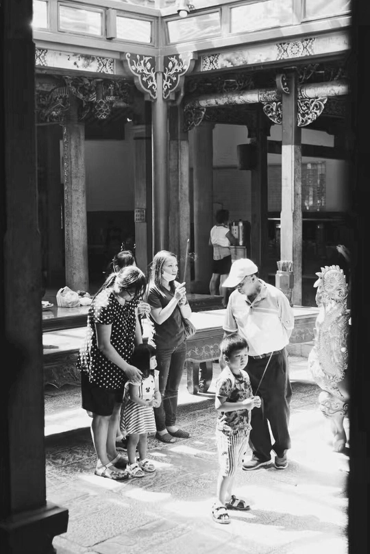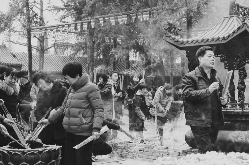 第一张:2017.10拍摄于台湾新竹义民庙 /在外闯荡的台北人带着后人回到家乡,拜会当地最敬仰的神。 新竹县新埔镇褒忠亭义民庙因收葬林爽文事件及戴潮春事件中阵亡的桃竹苗子弟兵忠骸,并祭祀乙未战争中因抗日保台而牺牲的忠灵,香火十分鼎盛。 在台北生活的半年,我走访了台湾大大小小的宫殿庙宇,信众基础最好的往往是本土化的神。之后我应好友之邀前往中原河南。 第二、三张:2018.2拍摄于河南少林寺 第四、五、六张:2018.2拍摄于河南白马寺 /正月间求平安的信徒络绎不绝。 与台湾举家祭拜不同,河南信众习惯一人代表全族,手握一大把香烛。男女老幼,高低贫贱,在神灵面前,都是平等的存在。 不知信众相信的是万物有灵,还是相信心诚则灵?