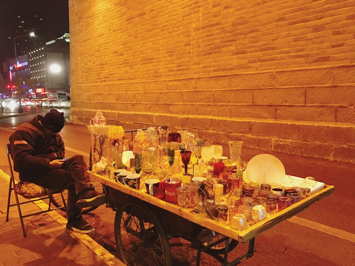 走街串巷 在西安城门下 遇见的小哥 无论是一份什么样的职业 在灿黄的路灯下 都显得格外引人注目