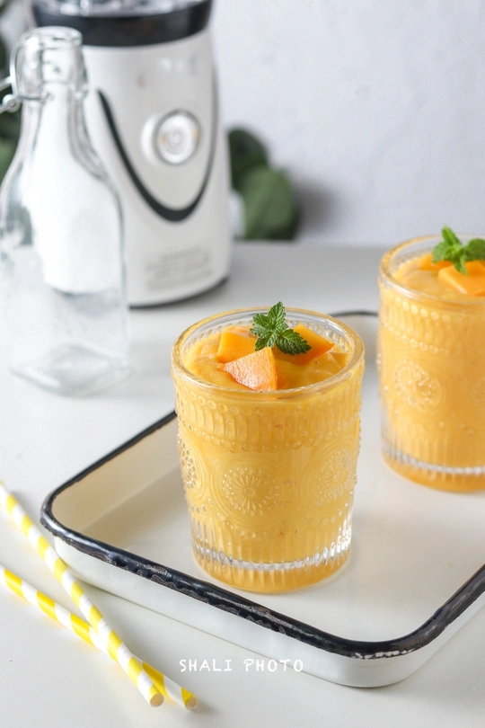 #沙砾的减脂厨房#别在外面喝奶茶啦,回家喝奶昔吧!自从减脂开始,我就极少在外面喝各种饮料啦,因为添加糖太多,吃糖太容易长胖了!在家做奶昔,水果+酸奶,减少糖分负担(当然无糖酸奶更好啦)。这次没注意看,错买了添加糖的原味酸奶,因为极少吃糖了,所以个人觉得这次的奶昔偏甜了,下次买无糖酸奶试试,再跟大家汇报咯~ 芒果酸奶昔做法: 1、准备1个中等个头的芒果,1杯酸奶(约100g),这个量可以做图中1杯奶昔; 2、将芒果剥皮,果肉切小块,和酸奶一起倒入料理机中,打20秒左右,果肉泥就能和酸奶很好地混合了; 3、把奶昔倒出来,装饰上果肉粒和薄荷,就可以美美地享用啦!