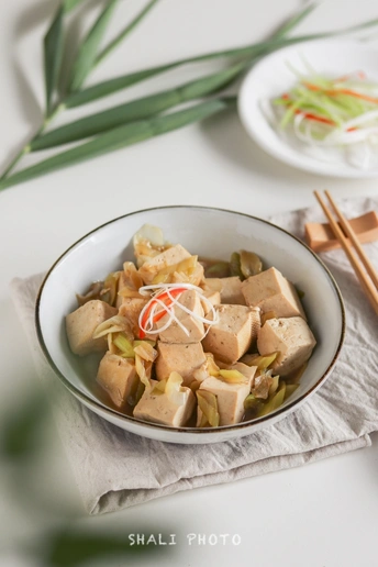 #沙砾的减脂厨房#今天分享一道高蛋白香喷喷的快手菜——大葱烧豆腐🍲,专治夏天没胃口、不想下厨房~ 做法: 1⃣️大葱1根,老豆腐1块(约250g),大葱择净根须叶片,葱白斜切成片,老豆腐切小块备用; 2⃣️锅烧热后,下凉油,加入葱片快速爆香,加入豆腐和清水,水没过豆腐一半以上,加入2勺生抽,大火收汁后出锅。