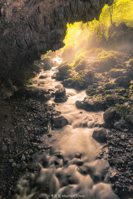 通灵大峡谷景区,我们从峡谷的洞中钻出来,突然就出现了一个洞穴和流水的世界。于是我架起相机,用慢门拍摄了这个画面。