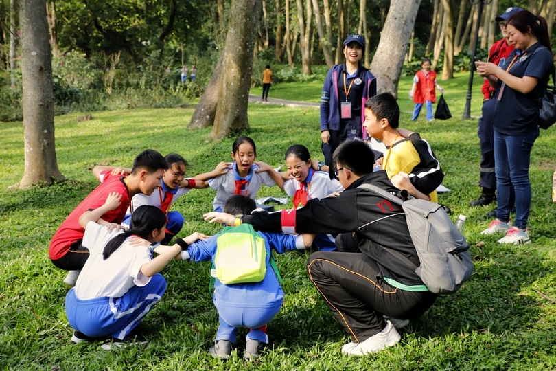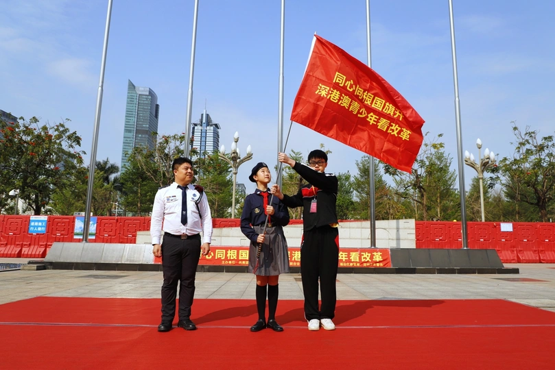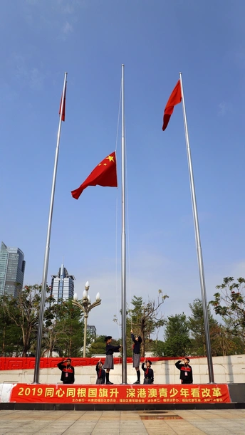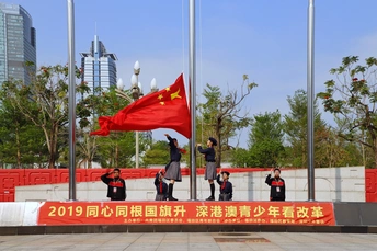 深圳少年宫红领巾广场,香港和深圳青少年同升国旗,参观改革开放40周年纪念展,一起团队活动,一家人,一家亲。