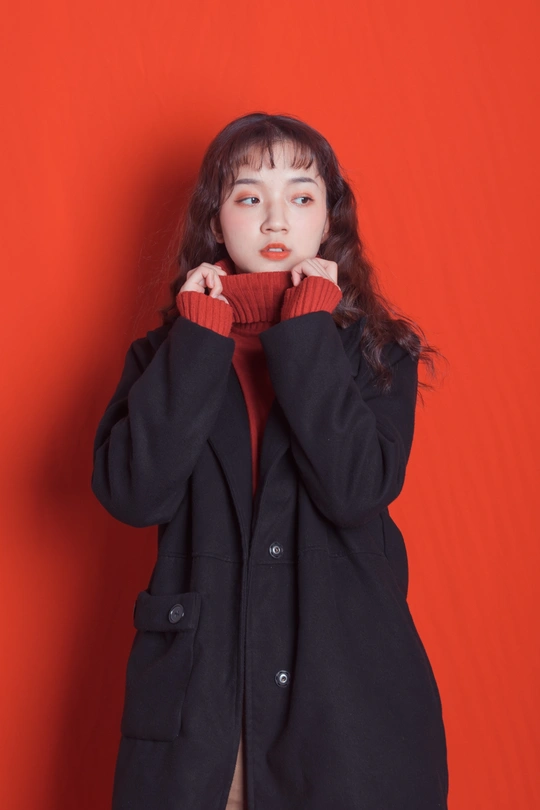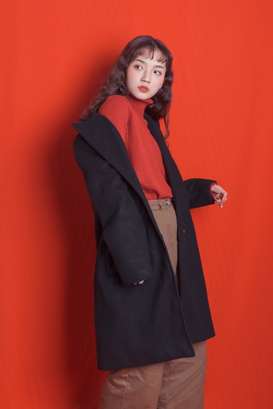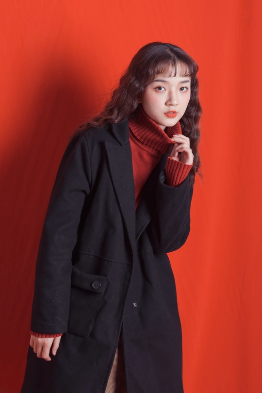 外套:黑色长款大衣 毛衣:红色高领毛衣 裤子:卡其色西装直筒裤 鞋子:converse 1970s系列黄色高帮鞋