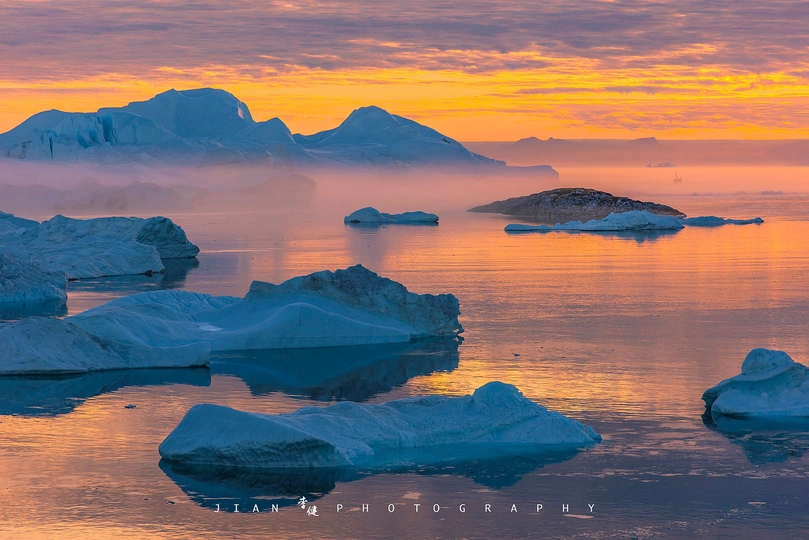 格林兰的午夜阳光下 气温骤降 冰山之中升腾起迷雾 航船在迷雾中穿行