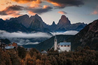 教堂的钟声回荡在清晨的空气里,你看那远山、教堂、晨曦、薄雾、彩云,还有那不远的村庄。这就是心中美好世界的模样。