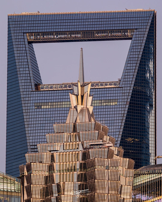 环球金融中心风洞口与金茂大厦对齐,上下层的观光厅人头攒动
