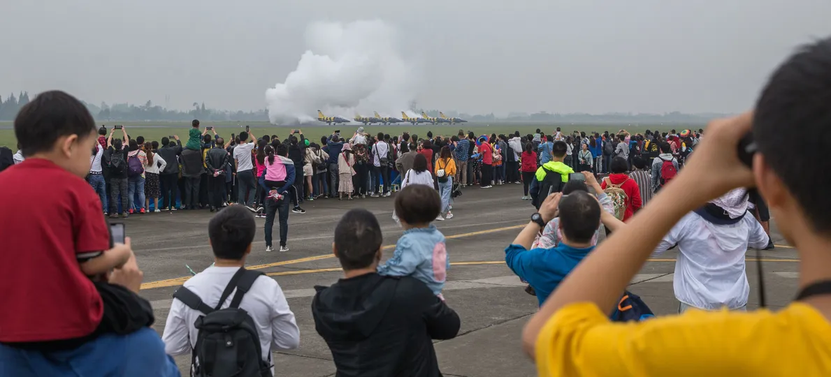 来自菠萝地海的小密蜂飞机,组队在飞行道中,人们期待待它的飞行表演。
