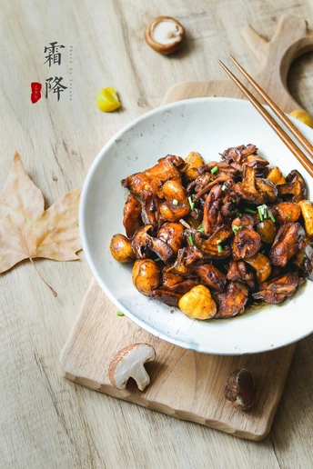 食令XLocana 霜降时节,板栗香菇红烧鸡 1⃣️食 材 土鸡、板栗、香菇、葱、姜、料酒、糖、盐 2⃣️做 法 ❶土鸡切块,焯水,生姜去皮切片,葱切段备用; ❷板栗入冷水锅,煮熟,待凉后擦干水分,用油煎30秒,盛出备用 ❸锅中倒油,放入葱、姜片爆香,倒入鸡块翻炒,炒干水分至鸡油析出; ❹倒入适量料酒、生抽、老抽,少许糖调味翻炒; ❺放入香菇、板栗,再加些水没过鸡块,中小火焖20分钟; ❻转大火收汁,起锅。 这里有个小提示:板栗去壳去皮,可以将板栗洗净,用刀切个小口,倒入少许盐,用水煮开后,过冷水去皮