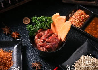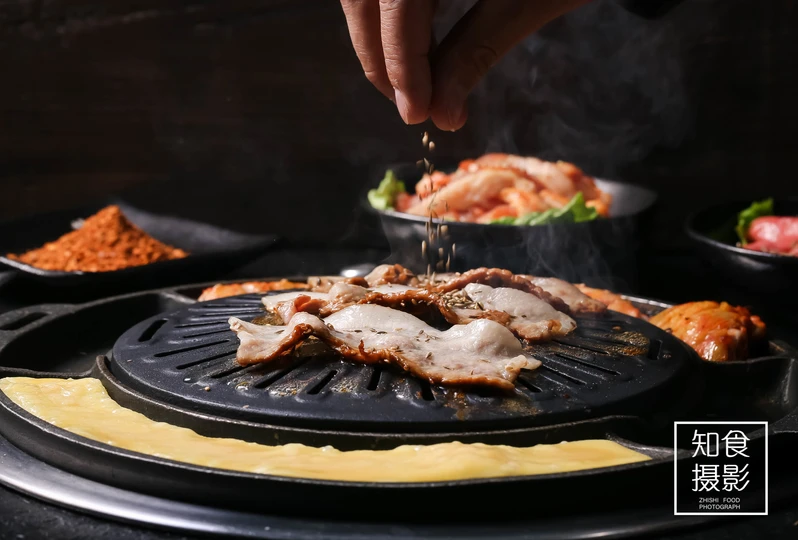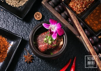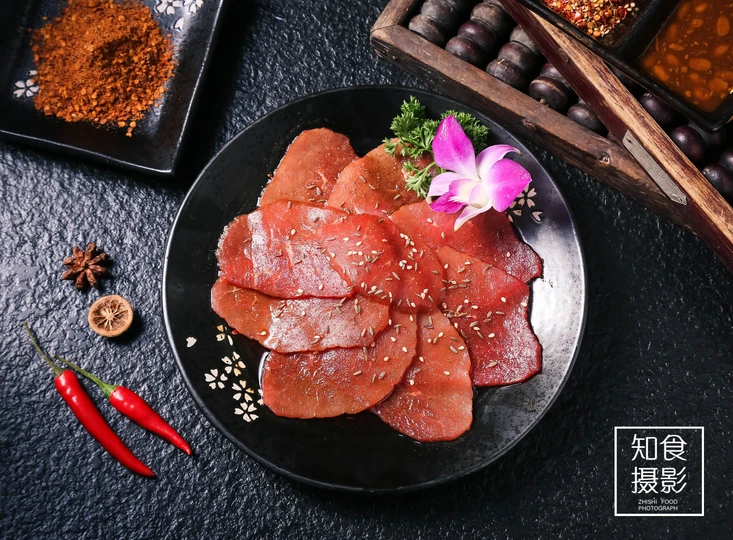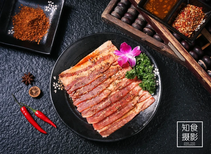 底面我们直接采用了店里标志性的石材桌面 加上店里的算盘作为老工业风的装饰 再搭配上新鲜的肉和一些辅助的调理 装饰一些辣椒,八角等卤料突出食材的口味 简单又复杂的一份答卷就完成了 还不赶紧约上朋友 周末上周末铺子?