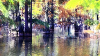 池衫颜色渐变的季节,红、黄、绿并存。图片后期稍加处理,是色彩朦胧成块状,犹如“调色板”上的油彩,展现大自然的魅力。
