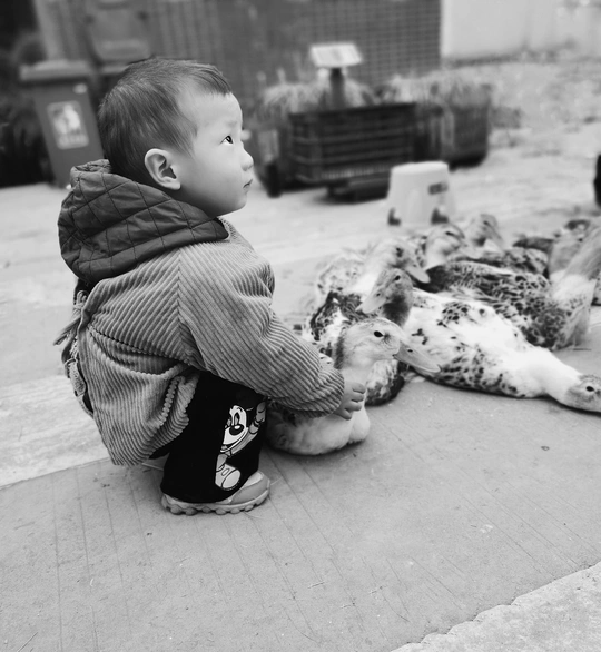 小三子每次赶场最喜欢看鸭子了,正在和鸭子玩的高兴,陌生人叫他不要捏鸭子脖子,三子就这样一直好奇的望着,好奇的抓拍下来[抱抱]