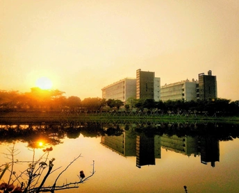黄昏时刻,落日的场景。夕阳染红了环院整片天空,天空的残虹和水中实训楼的倒影,渲染了晚霞的美。在月牙湖左面记录这么一幕