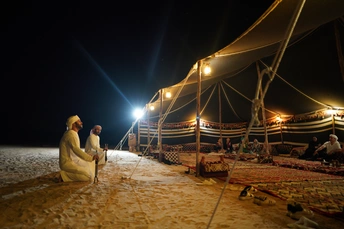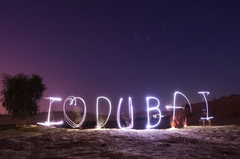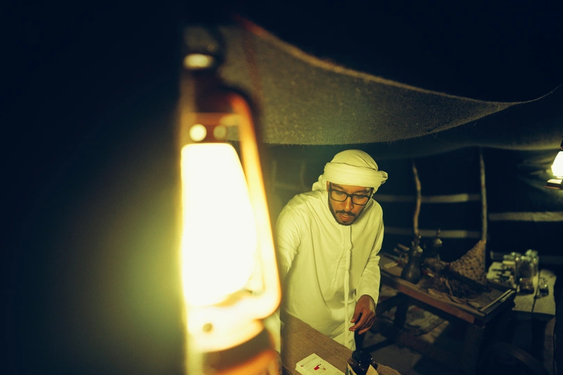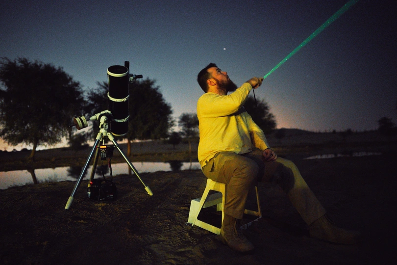 夜色如同时光专列,返回贝都因人的古老部落,篝火边咖啡飘香,用舞步打发等待美食的时间,饱餐后才有力气顺着观星笔认识每一盏星辰的传说 starlight from DUBAI