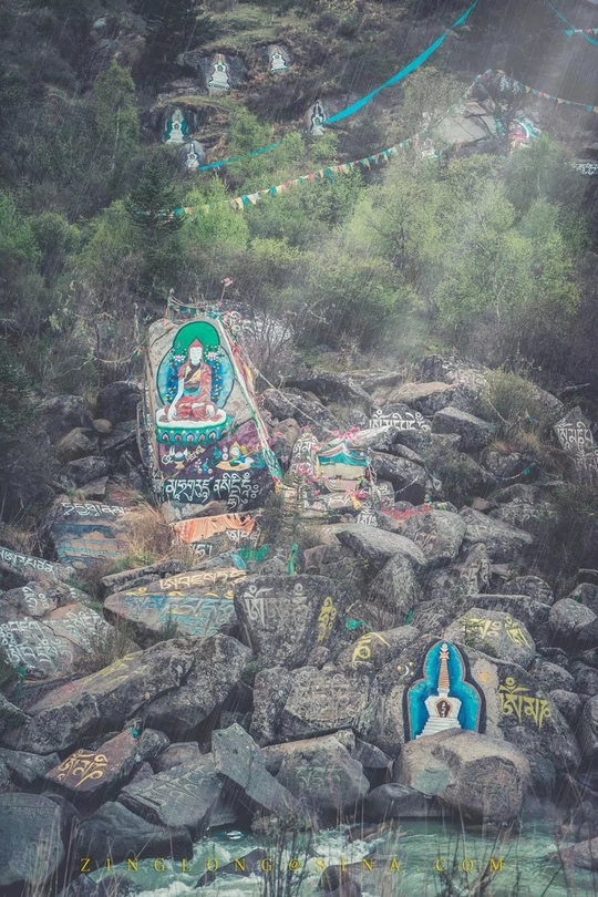 流淌的河水、佛经、佛像!新都桥至塔公寺中途的河边,正好遇到了下雨!