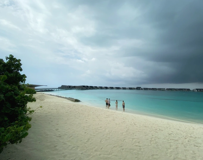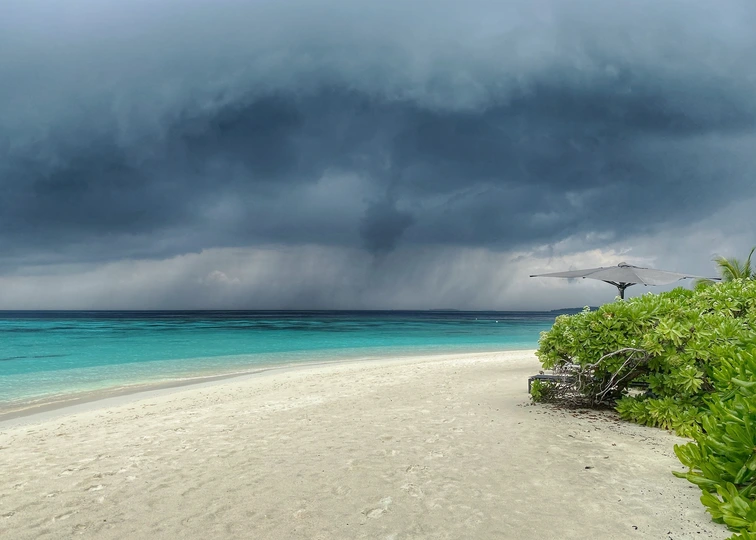 马尔代夫沃姆里岛的海滩。刚才还是晴空万里,转眼间一片乌云滚滚而来,雷声阵阵,天海之间能够看到下垂的雨线。大雨就要来了。