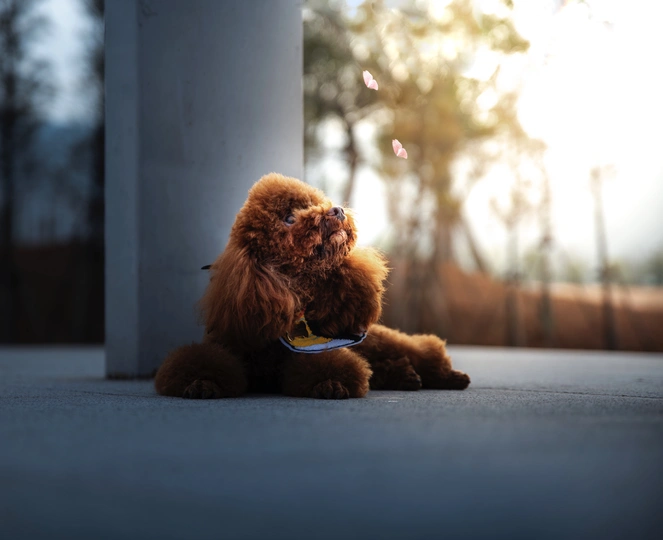 一只比较需要安全感的泰迪,它怕高,只要主人在身边,他便趴在地上看着 给它拍摄的时候刚好在逆光处,它看了看飞过的小鸟,后期我换成了蝴蝶。