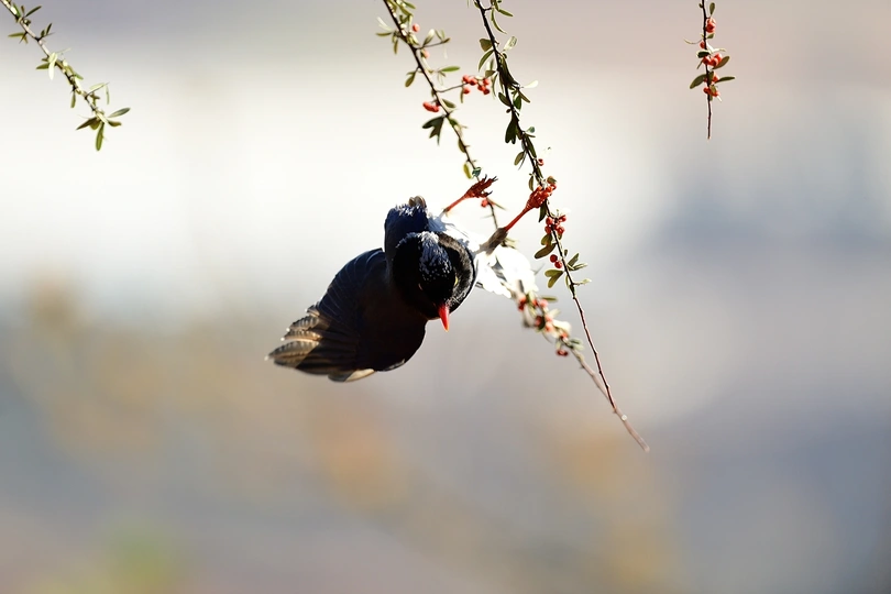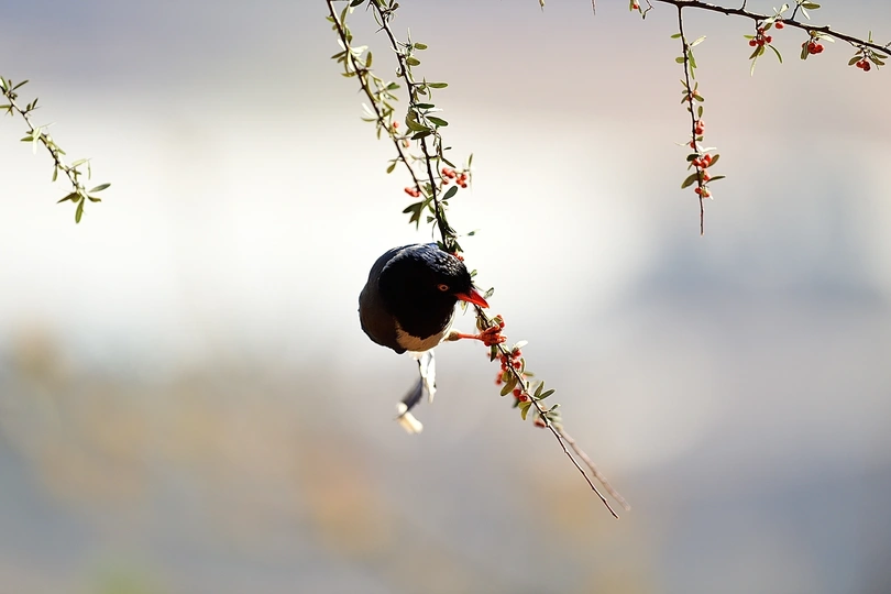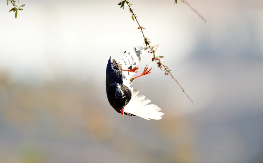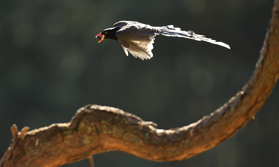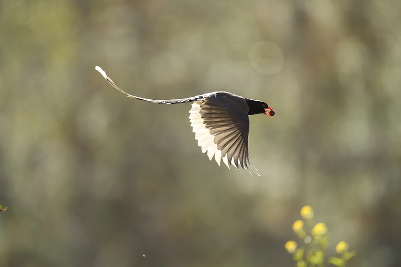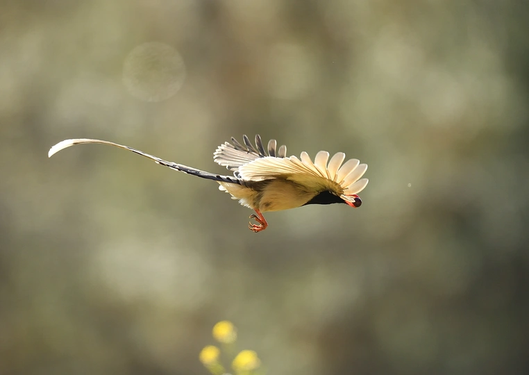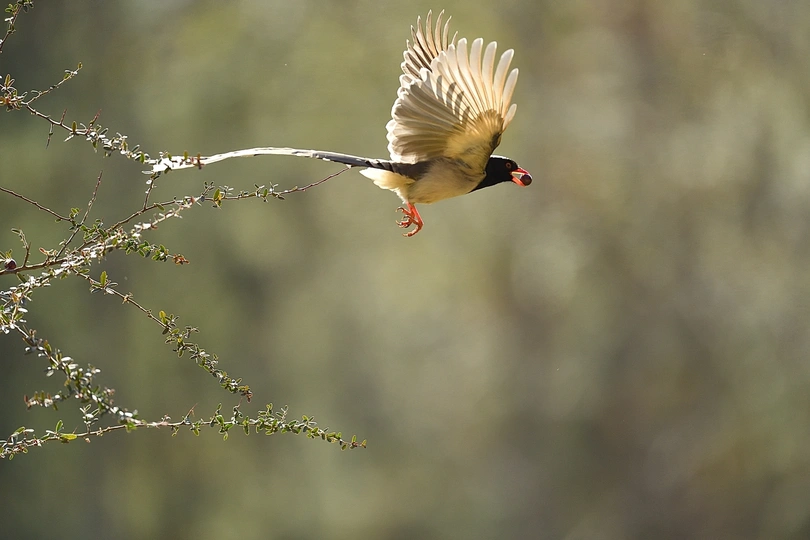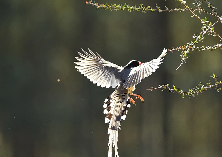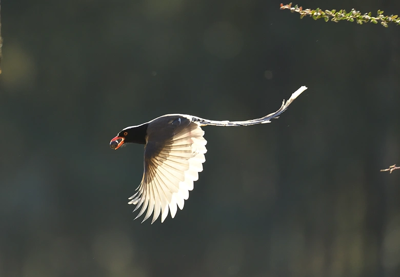 妙曼飞羟~~红嘴蓝鹊,蓝色的羽毛,红嘴红脚,飘逸漂亮的长尾羽。各种妙曼飞姿,常惹得摄影师眼花缭乱、心旷神怡,但性情凶悍,会主动围攻猛禽,生性活泼而嘈杂,飞翔时多呈滑翔姿势,速度极快。光影、姿态、速度、背景都要考虑,要得到一张红嘴蓝鹊好作品很不容易,所以红嘴蓝鹊是许多拍鸟人喜爱的追逐对象。