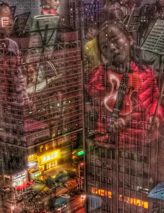 透过玻璃窗,学小提琴的孩子与夜幕下的城市高楼交相辉映