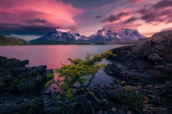只出现了几分钟的红光。我旁边还有两位摄影师一起挤在这么小的空间。构图上我当时想自己的机位更靠前更高一点,这样可以将小树完全放在岩石空挡的水背景中。不过这样的话,我的相机会进入别人的画面。不管怎么说,难得这么好的红光,也挺喜欢的。