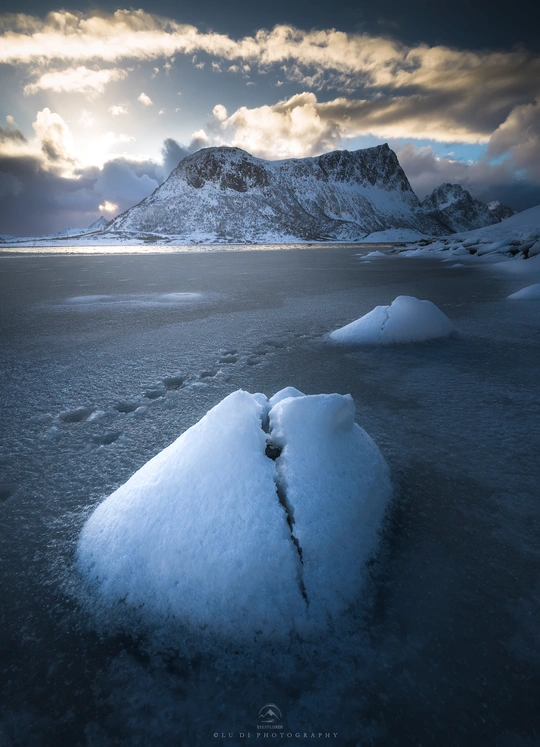 冬季罗佛敦群岛经常能遇到非常异形的场景。眼前的这个前景,经常被人们称作是外星人的蛋,沿路途中无意间发现了这里,这也正是我们希望寻找及看到的前景。左前方小动物的脚印如同外星人的足迹,给这异形场景增添了些许神秘色彩