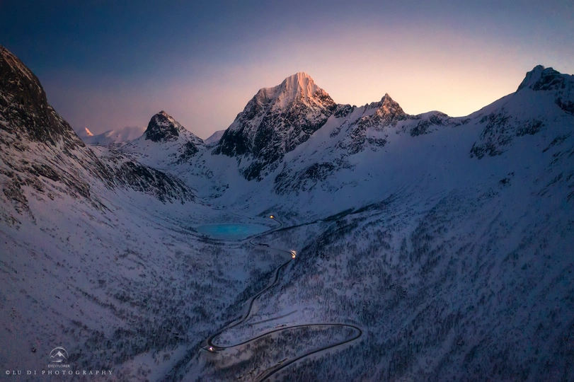 冬天的挪威,可以说是冰雪世界,尤其今年,挪威北部的雪下得非常大。同时冬季日照时间非常短,当开车赶到这里时,太阳已经下山,天色已经很暗,强行飞起无人机,寻找不一样的视角,探索冰雪挪威。