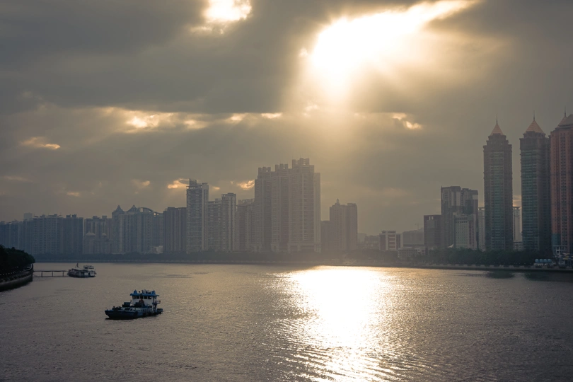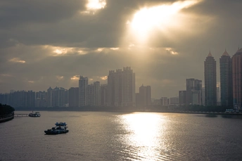 早上,经过经过海印桥过江,天上太阳透过厚厚云层射出光芒,给与你希望憧憬,犹如天神降临