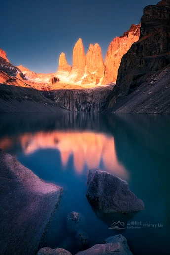百内三塔最著名的一个景观就是日出时第一缕红光打在三个如尖塔一样的石壁上的情景,因为时花岗岩山体,完整的接受并反射出日出的红光,也因此而著称。