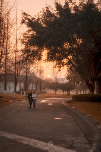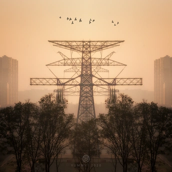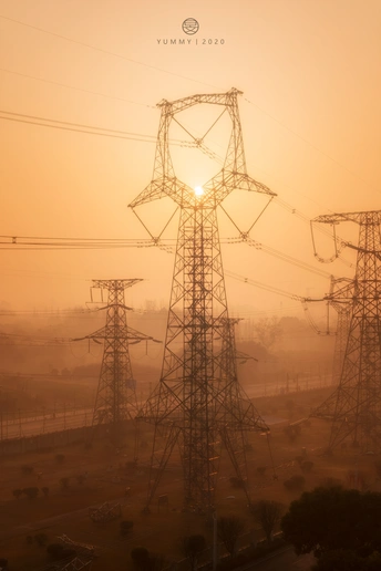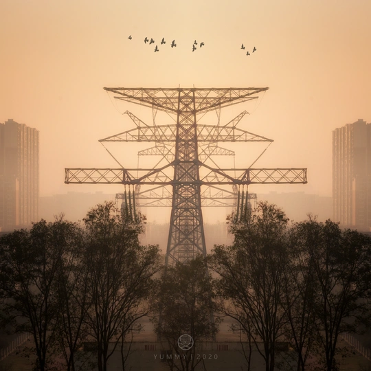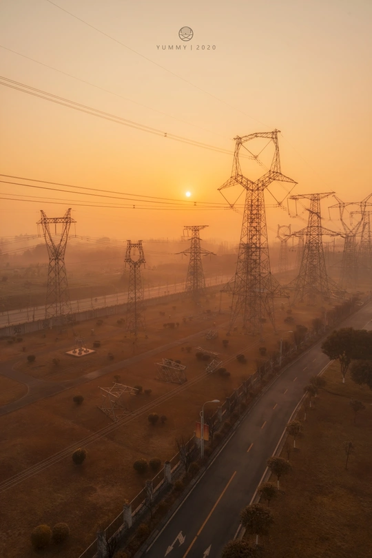 浓浓的云雾笼罩着铁塔,不断地扩展着,飘动着,升腾着,冬日太阳用温暖为云雾染上了淡淡的暖黄。