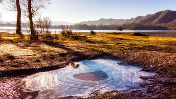 温馨晨光中,念湖旁一池冰层晶莹剔透!