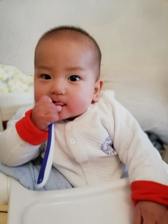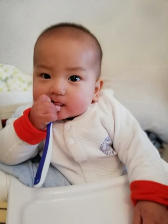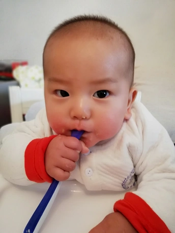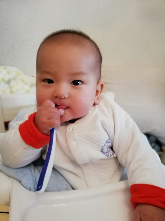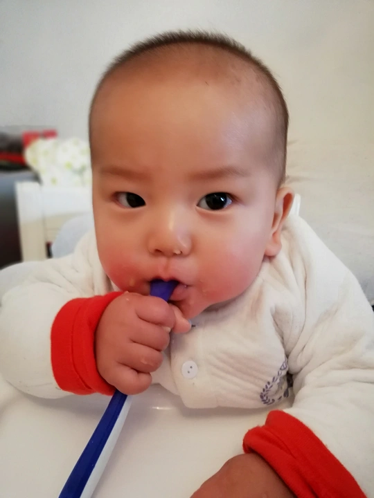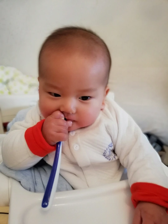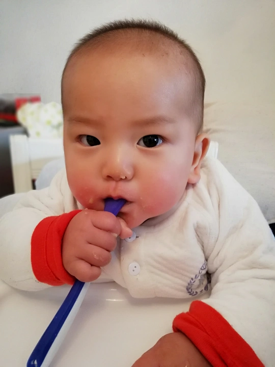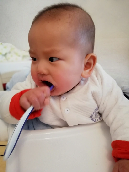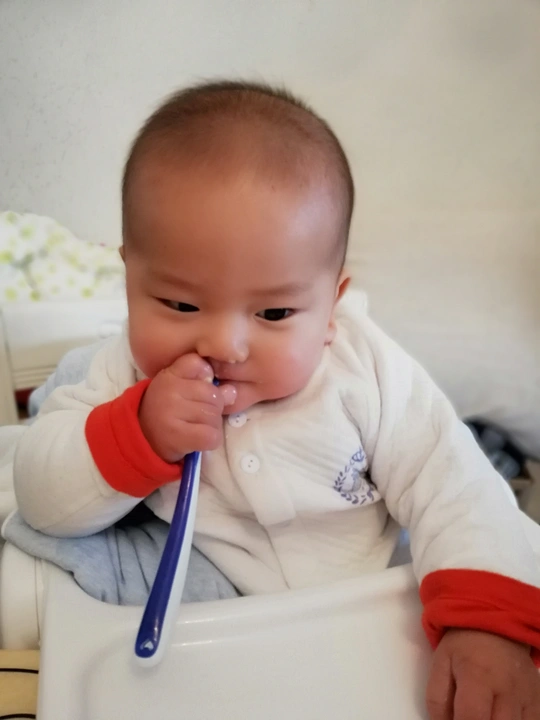 孙子开始学习吃辅食,听说先玩了食物才会对