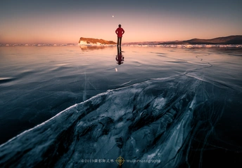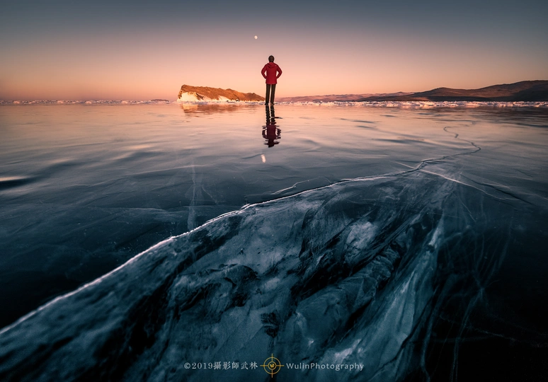 贝加尔湖的冰面一望无际,但是这是一张意外得来的照片,那一天早上因为车辆故障的关系,我们原计划上午十点从城市出发,结果因故障,被延迟到12:30出发,在路上经过5个小时的车程,我们抵达奥利洪岛码头,迎接我的是我的老朋友们(岛上的司机),这时天色已晚,恰逢拍摄的好时机,落日的余光以及月亮的高挂,一路上狂奔,却未见适合的场景,直到看到前方的线条和纯净的冰面,还有之前已经发布的气泡,我们在夹缝中的时间中赢得喘息和拍摄的时间, 迎接的却是无尽的喜悦,队员们兴奋不已,刚到贝加尔湖就遇见如此漂亮的场景,通过冰裂我们知晓冰块的厚度,一名队员站在镜头前,为场景增加了对比和点缀。
