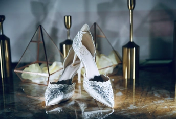 婚礼跟拍的一幅图。新娘走上舞台时所穿的婚鞋,别具一格的美。